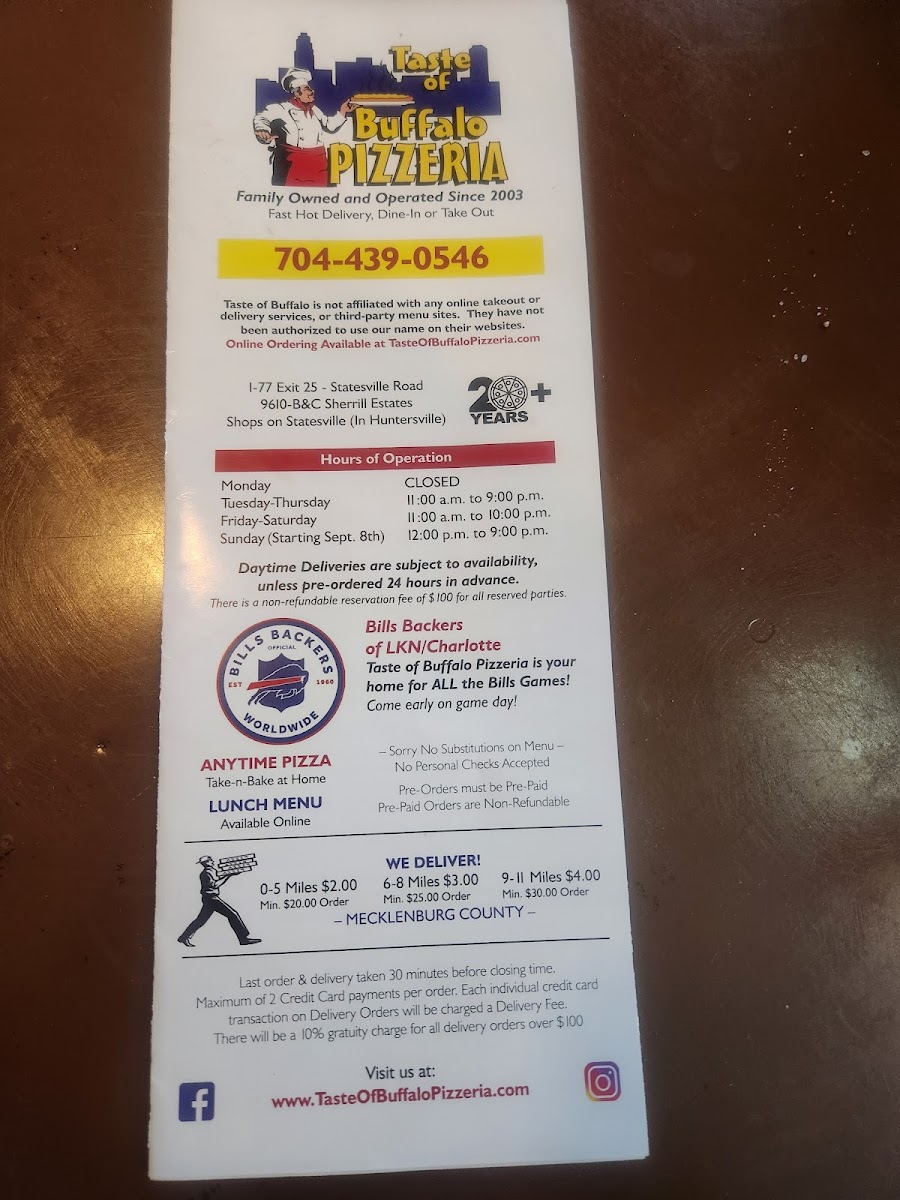 Taste of Buffalo Pizzeria offers a nostalgic culinary experience that brings the heart of Western New York to Huntersville, NC. Their menu features a variety of customizable options, including traditional pizzas that can be tailored to your personal taste. Whether it's a Build Your Own pizza or a classic Pepperoni Calzone with Ricotta Cheese and Marinara, there's something for everyone.